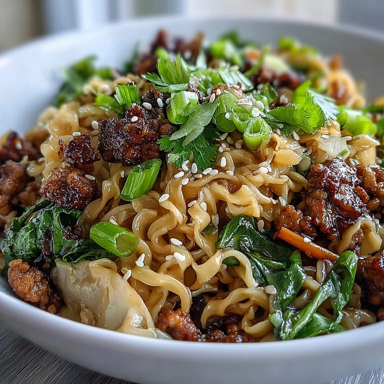 The seasoning blend on the ground pork mirrors traditional dumpling filling—soy sauce, toasted sesame oil, white pepper, and sugar. The same savory sauce flavors coat the noodles, creating that unmistakable potsticker taste profile.